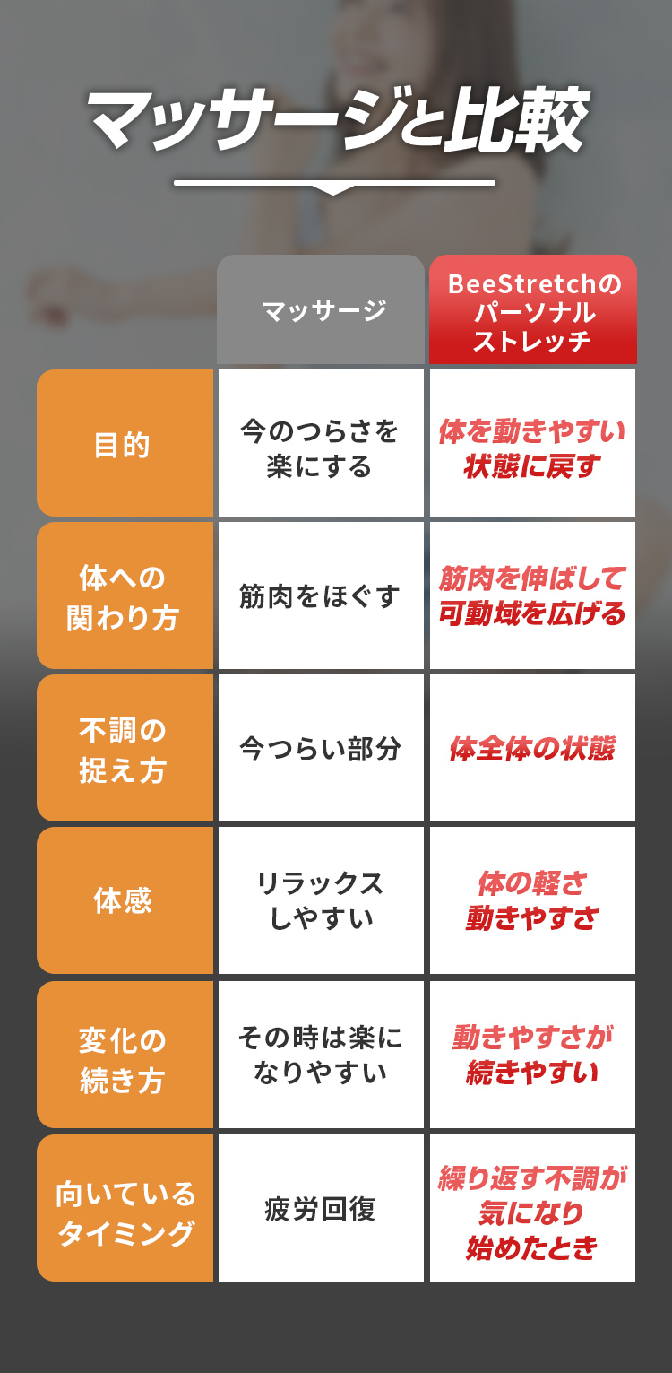 腰がつらい時はマッサージに通っていましたが、ストレッチを受けてみて、動きやすさの違いを感じました。施術後のスッキリ感が続くのが印象的です。